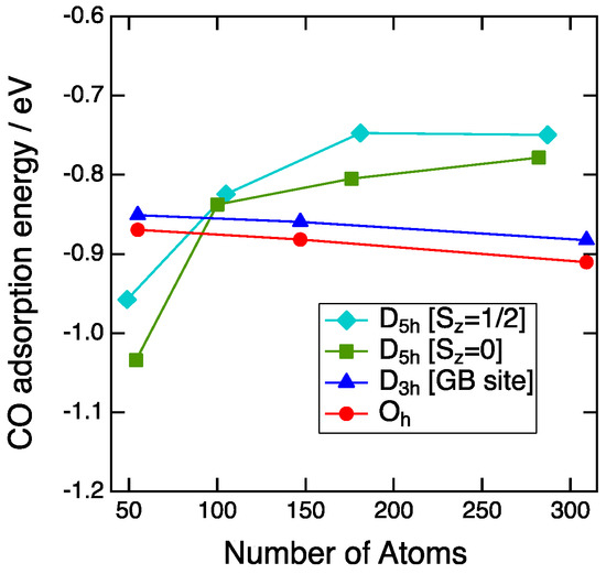 Figure 4 shows the plot of the CO adsorption energy on the vertex sites as a function of the number of Au atoms. For the Oh-NP and D3h-NP, CO adsorption strength gradually decreases as the increase of the number of Au atoms. The differences in energy between the size of about 1 nm and 3 nm are 0.04 eV for the Oh-NP and 0.03 eV for the D3h-NP. Thus, the adsorption energy is mainly determined by the local environment of the adsorption sites, such as the coordination number (CN). The CN of the adsorption sites is a good descriptor for the CO binding to Au NPs [7,19]. Since the CN of the vertex sites of the Oh-NP and D3h-NPs is equal to five, CO adsorption energies of the Oh-NP differ slightly from those of the single-twin NP in all sizes. For the second and the third generations, the D5h-NPs show weaker binding than the Oh-NPs. This is also explained by the coordination number. The CN for the D5h-NP is six, whereas that for the Oh-NP is five. Therefore, the more unsaturated site of the Oh-NP results in the more stable adsorption of CO. The exception occurs in the case of the first generation of the D5h-NP.