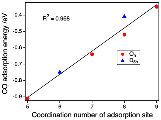 CO adsorption energy as a function of the coordination number of adsorption sites. Red circles and blue triangles represent the CO adsorption energies on the Oh-NPs and D5h-NPs (Sz = ½), respectively.
