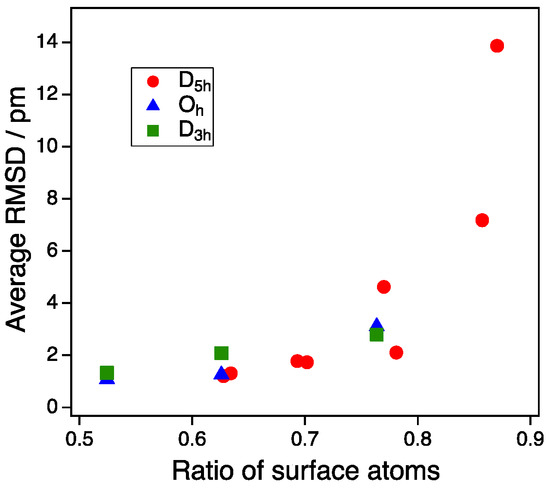 Finally, we suggest a ratio of surface atoms as a simple descriptor of the deformation effect mentioned above. Figure 6 shows the plot of the average RMSD for the vertex adsorption of all NPs as a function of the ratio of surface atoms to all atoms of the NPs. When the ratio of the surface atoms was 0.8 or more, the deformation described by the average RMSD increased sharply. Although this deformation occurred only for the multiple twin NPs (D5h-NPs) in our case, this would also occur for NPs that have a symmetry other than D5h in the case of the smaller size of NPs. Since the average RMSD represents the stability of Au NP upon CO adsorption, there is a possibility that the ratio of surface atoms can be a reaction descriptor for small NPs, in which the stability is significant for gas adsorption.