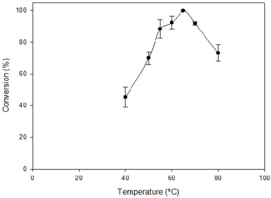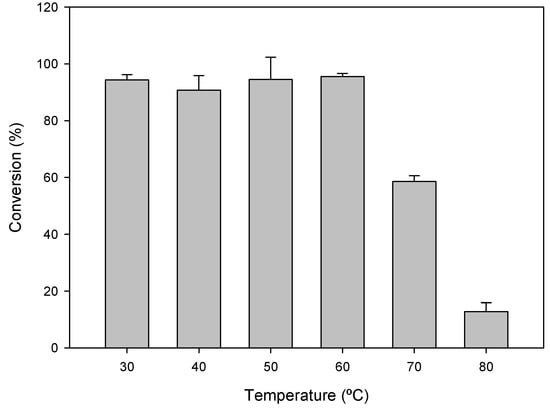 Optimum reaction parameters were studied for the production of l-amino acids by varying pH, temperature, and the ratio of immobilized enzymes. pH was changed from 6 to 9.5 using 10 mM cacodylate with a pH from 6 to 7, 10 mM triethanolamine with a pH from 7 to 8, 10 mM borate with a pH from 8 to 9, and 10 mM glycine with a pH from 9 to 10 (Figure 2). The system showed a broad spectrum of pH from 7 to 9, with maximum activity at 8 in 10 mM borate–Na buffer. In contrast, with protein in solution, the spectrum was narrower, as the enzymatic cascade showed a 40% loss of activity at pH 7 and 9 [9]. The temperature of the system was tested from 50 to 70 °C, maintaining more than 80% activity up to 70 °C (Figure 3). When the system was incubated for 4 h at different temperatures from 30 to 80 °C, it maintained 100% activity at 60 °C, 60% at 70 °C, and 20% at 80 °C (Figure 4).