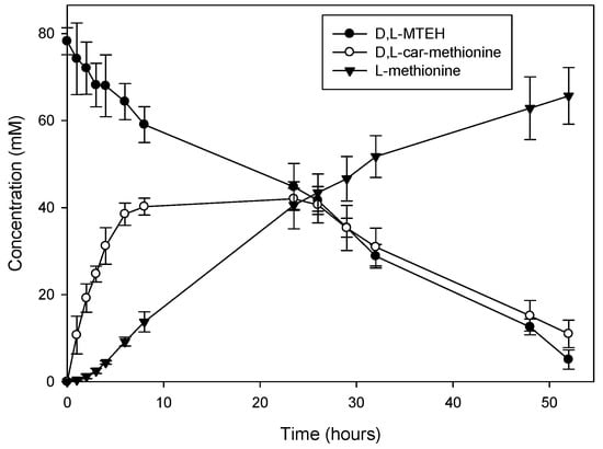 Conversion curves of d,l-5-methylthioethylhydantoin into l-methionine by immobilized biocatalyst on IB-350 (Cycle 1). (●) d,l-5-methylthioethylhydantoin, (○) N-carbamoyl-d-methionine, and (▼) l-methionine.