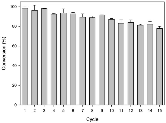 The system has been tested for the production of 11 coded and non-coded amino acids. The following optically pure amino acids have been obtained from the corresponding racemic mixture of hydantoins in the reaction times indicated as follows: l-methionine in 150 min, l-norvaline in 200 min, l-norleucine in 200 min, l-ABA (amino butyric acid) in 50 min, l-homophenylalanine in 25 min, and l-valine in 40 min. The enzymatic cascade showed a slight accumulation of carbamoyl, as we can see in the production of l-methionine in Figure 5. For the l-amino acids, l-phenylglycine, l-phenylalanine, l-para-hydroxy-phenylglycine, l-tryptophan, and l-tert-leucine the system did not work efficiently (data not shown). The hydantoins d,l-p-hydroxyphenylhydantoin, d,l-phenylhydantoin, d,l-benzylhydantoin, and d,l-indolyl-methylhydantoin were hydrolyzed to the corresponding carbamoyl but not to the corresponding l-amino acid. The system has been tested over several reaction cycles (Figure 6), maintaining 80% activity for over 15 cycles and complete stability of the proteins. The immobilization has proven to be stable and correctly arranged in the porous matrix.