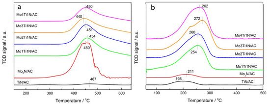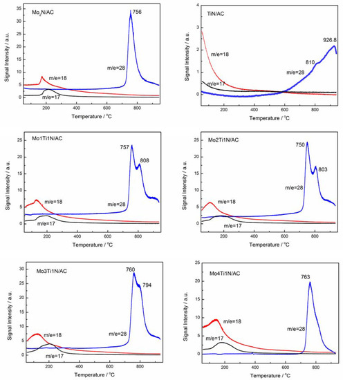 From Figure 1, bonding between Ti and N in the TiN/AC sample can hardly be observed; besides, Mo, Ti, and N further combined with each other in the BTMNs. We used temperature-programmed desorption–mass spectrometry (TPD-MS) analysis to solve that problem according to the three different gases used for desorption, which were NHx (x = 1 – 3) (m/e = 17), H2O (m/e = 18), and N2 (m/e = 28) [33], as shown in Figure 2. The former two gases always appear as a desorption peak at low temperatures. If a peak of NHx arises, this means that an amount of NHx groups were present on the surface of the catalysts during the calcination process. As the catalyst adsorbs water from the air, the peak of H2O would increase. Both peaks emerged for Mo2N/AC as the temperature approached 200 °C. However, unlike Mo2N/AC, for TiN/AC the location of these two peaks appeared beginning at 50 °C. Then, on combining the two TMNs together, in comparison with Mo2N/AC not only did the area of the water peak increase, but the peak also shifted to lower temperatures. Moreover, the shape of the NHx peak became broader, which shows that the change in ingredients led to a change in the adsorbed surface groups on the catalysts. The peak of N2 underwent the most evident change of all. When the bond between the metal and nitride that exists in TMNs breaks, this would lead to the production of N2 in the high-temperature range [33]. A sharper peak emerged at 756 °C for Mo2N/AC, which confirmed the bonding between Mo and N in the catalyst. In comparison with this, TiN/AC had two peaks at 810 and 926.8 °C, which means that two different combined forms of Ti and N were present. BTMNs basically displayed a combination of two peaks around 760 and 800 °C, which corresponded to Mo-N and Ti-N bonds, respectively. A more obvious phenomenon was that the desorption temperature of Mo-N shifted upward; in contrast, that of Ti-N shifted downward. This indicated that the three elements underwent mutual combination in the BTMNs catalysts, not simply mechanical mixture. Mo4Ti1N/AC did not display two clear N2 peaks, and only a faint shoulder peak was discovered around 800 °C, which resulted in the conclusion that the content of Ti was minimal. This analysis directly confirms that bonding between the metal and N was present in BTMNs.
