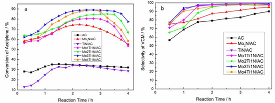 The (a) acetylene conversion and (b) VCM selectivity over catalysts of AC, TiN/AC, Mo2N/AC, Mo1Ti1N/AC, Mo2Ti1N/AC, Mo3Ti1N/AC, Mo4Ti1N/AC; Reaction conditions: Temperature (T) = 180 °C, C2H2(GHSV) = 50 h−1, VHCl:VC2H2 = 1.15:1.