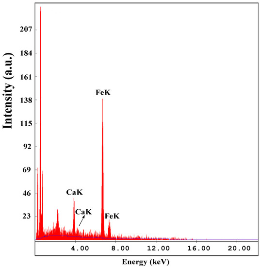 Figure 1 shows the X-ray diffractometer (XRD) pattern of the heterogeneous base catalyst, nano-Ca(OH)2/Fe3O4. The analysis of the synthesized nano-Ca(OH)2/Fe3O4 catalyst had the characteristic peak at the 2θ value at 18.0° and 63.0° which were the characteristic peak of Ca(OH)2 (JCPDS Card No. 044-1481). The peaks that occurred at 2θ values of 18.0°, 30.3°, 35.7°, 43.4°, 53.9°, 57.4°, and 63.0°, corresponds to Ca(OH)2, Fe3O4, Fe3O4, Fe3O4, CaO, Fe3O4, Ca(OH)2, respectively. The composition of the catalyst was verified with an Energy-Dispersive Spectroscopy (EDS) mounted on an Environmental Scanning Electron Microscope (ESEM). Figure 2 displays the Energy-Dispersive Spectroscopy (EDS) spectrum of the nano-Ca(OH)2/Fe3O4 catalyst. For the catalyst synthesized by CaCl2 and Fe3O4 at a ratio of 7:1, the molar ratio of Ca(OH)2 to Fe3O4 of the as-synthesized catalyst was about 7:1. Previous studies showed that there is an optimal amount of calcium in the catalyst [30,31]. If the Ca:Fe ratio is too small, the activity of the catalyst is too low, and the catalyst is ineffective. On the other hand, as Ca(OH)2 tends to aggregate, the specific surface area will be reduced if the Ca:Fe ratio is too high.