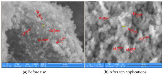 The material structure of the catalyst, captured by the Environmental Scanning Electron Microscope (ESEM). Plot (a) represents the initial size of the grain was between 40 nm and 55 nm. Plot (b) shows the grain size increased to between 65 nm and 90 nm after repeated applications.