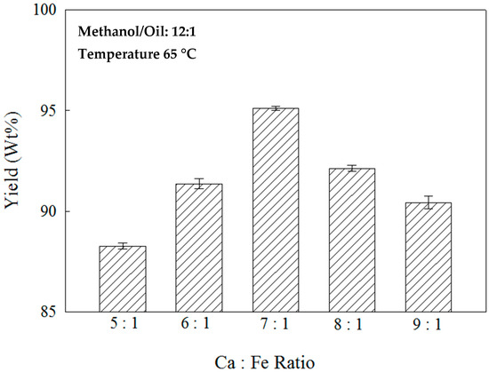Effects of the catalyst Ca:Fe ratio on the yield with a methanol/oil molar ratio of 12:1.