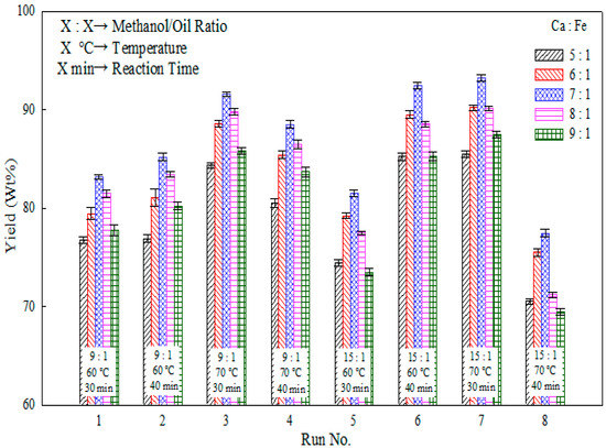 The impact of temperature on the yield of FAME under different experimental conditions can be seen by comparing the results in Runs 1, 2, 5, and 6 (60 °C ) against those in Runs 3, 4, 7, and 8 (70 °C) in Figure 5. At 60 °C, a higher yield can be obtained by increasing the methanol/oil ratio and lengthening the reaction time (Run 6). The longer reaction period is needed to ensure a complete transesterification reaction at low-to-moderate temperatures. Meanwhile, maintaining a methanol/oil ratio of 9:1 and a longer reaction time improves the yield of FAME. However, for a heating time of 30 min (i.e., Run 1 versus Run 5), a lower methanol/oil ratio will improve the yield. Therefore, if the reaction takes place at a sub-optimal condition, lowering the methanol/oil ratio will improve mixing between the oil and catalyst, which in turns raises the yield. Meanwhile, when the temperature was raised to 70 °C, the highest yield was obtained using a 15:1 methanol/oil ratio and a heating time of 30 min (Run 7). Even with a 9:1 methanol/oil ratio, a reaction time of 30 min also resulted in better yield at 70 °C (Run 3). This result suggests that at a higher temperature, it is desired to shorten the reaction time as hydrolysis might otherwise occur and reduce the yield of FAME.
