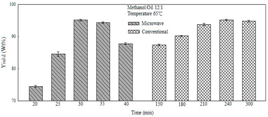 Figure 8 compares the performance of microwave heating against conventional heating for the transesterification reaction. All cases in the figure were completed using a catalyst Ca:Fe ratio of 7:1, methanol/oil ratio of 12:1, and temperature of 65 °C. Comparing the data in the figure, the advantage of microwave heating is obvious, as it takes only 1/6th as long to achieve the maximum yield. The highest yield levels from both microwave heating and conventional heating are similar, at about 95%. The extended reaction time may lead to the loss of methanol through evaporation, which results in a lower yield level. Furthermore, the extended reaction time may cause hydrolysis, which also causes the lower yield of FAME. The results in Figure 8 show that a microwave system can significantly lower the power consumption (due to shorted heating duration) in biodiesel production.
