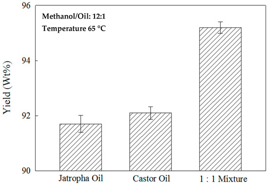 Figure 9 displays the optimized yield of biodiesel using pure jatropha oil, pure castor oil, and the mixed feedstock oil. The reaction time was 35 min for the pure oils and 60 min for the mixture. The mixed feedstock oil resulted in the highest FAME yield of 95.2 wt %. The yields of FAME are 91.7 wt % and 92.1 wt % for jatropha oil and castor oil, respectively. The lower yield of jatropha oil is most likely due to saponification because of high acidity, as a base catalyst was used in this study. For castor oil, a longer reaction time is needed as a result of high viscosity, which lowered the yield because of the hydrolysis resulting from the lengthy reaction duration.