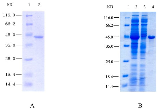 (A) SDS-PAGE of the purified native HSPHZZ from Pseudomonas sp. ZZ-5. Lane 1, molecular weight standards; Lane 2, superdex-200 gel filtration chromatography product (purified enzyme); (B) SDS-PAGE of the purified recombinant HSPHZZ from Pseudomonas sp. ZZ-5. Lane 1, molecular weight standards; Lane 2, crude cell extract; Lane 3, supernatant after centrifugation; Lane 4, supernatant after centrifugation; HSPHZZ after nickel affinity chromatography.