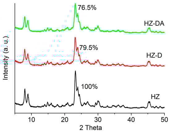 Figure 3 shows the XRD patterns of tested ZSM-5 catalysts. All catalysts displayed the Mordenite Framework Inverted (MFI) structure with different crystallinities estimated according to the relative response of plane (501) at 23.3° using HZ as the reference [23]. Compared to HZ, HZ-D and HZ-DA showed lower crystallinities (approximately 80%), implying parts of the zeolite skeleton could be damaged in the basic medium.
