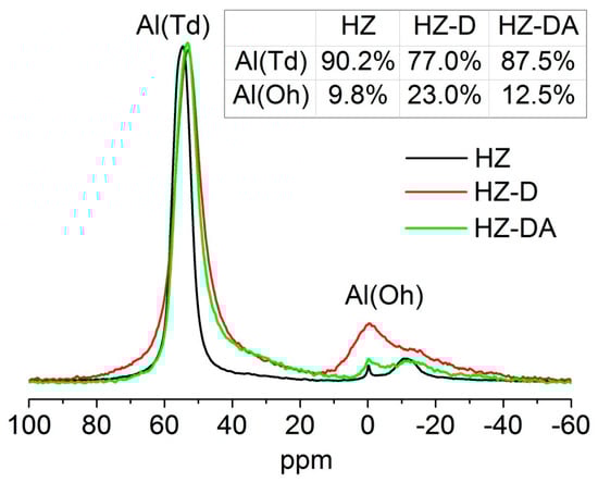 Figure 4 exhibits the 27Al NMR spectra. The resonances of framework tetrahedral Al (Al(Td), 54 ppm) and non-framework octahedral Al (Al(Oh), 0 ppm) can be specified [24]. The relative composition of these two Al species was calculated based on the area under the response. HZ had 90% framework Al(Td) with 10% non-framework Al(Oh). A more than two-fold increase of Al(Oh) (from 10% to 23%) and a substantial decrease of Al(Td) (from 90% to 77%) were observed on HZ-D. This variation indicates the presence of alkaline-induced Lewis acidic Al species on the outer surface [22]. As for HZ-DA, Al(Td) seemed to grow back from 77% to 87% with Al(Oh) that decreased from 23% to 13%. The increased Al(Td) ratio was possible caused by a re-alumination process through which some extra-framework Al could be reinserted into the ZSM-5 framework in an acidic environment [25,26], while the decrease of Al(Oh) indicates that some extra-framework Al species were removed from the outer surface. Briefly, HZ-D had the highest compositions of Al(Oh) and the lowest compositions of Al(Td) among tested catalysts.