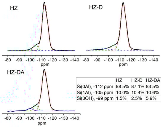 Figure 5 displays the 29Si resonance, and can be deconvoluted into Si(0Al) at −112 ppm, Si(1Al) at −105 ppm, and Si(3OH) at −99 ppm, respectively. The relative composition of Si(0Al) decreased in the following order: HZ (88.5%) > HZD (87.1%) > HZDA (83.5%), while Si(1Al) and Si(3OH) increased in the order HZ (10.0%) < HZ-D (10.4%) < HZ-DA (10.6%) and HZ (1.5%) < HZ-D (2.5%) < HZ-DA (5.9%), respectively. This fluctuation indicates that Si is etched from the ZSM-5 framework when ZSM-5 is subject to the basic and the acid treatments. Table 2 presents the framework Si/Al ratios ((Si/Al)F) estimated through the equation proposed by Thomas [27] and the bulk Si/Al composition ((Si/Al)B) acquired by ICP analysis. The (Si/Al)F ratio declined monotonically in the following order: HZ (40) > HZ-D (39) > HZ-DA (38), which was in agreement with the above-mentioned trend of decreasing framework Si concentration. The close (Si/Al)F ratios of tested catalysts implies that the employed alkaline and acid treatments remove mainly amorphous Si and Al species, and the ZSM-5 framework could be preserved. The (Si/Al)B ratio decreased from 39 (HZ) to 24 (HZ-D) after an alkaline treatment, and then rose to 37 (HZ-DA) after a subsequent acid wash. This fluctuation is related to the dealumination through the acid treatment.
