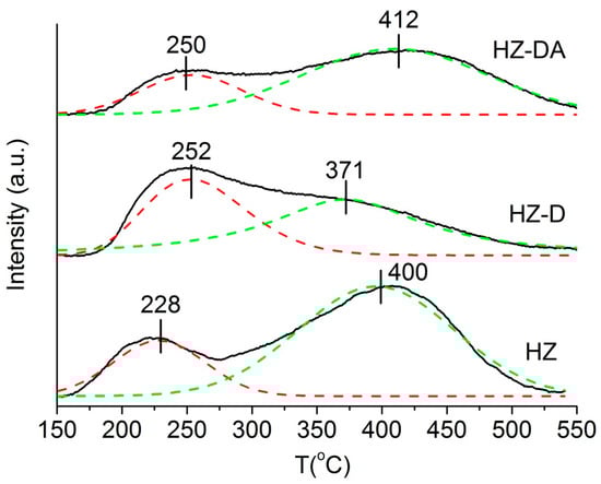 Figure 6 shows the NH3-TPD profiles, and Table 2 lists the acid site densities. Two responses, corresponding to the weak (Lewis) and the strong (Brønsted) acids, could be specified in 170–270 °C and 270–500 °C [28,29]. Compared to the temperature of the maximum desorption rate (Tmax) of the Lewis acid of HZ (228 °C), HZ-D and HZ-DA had higher Tmax’s (252 and 250 °C, respectively), this increase in the temperature of desorption was possibly caused by newly-created Lewis acidic Al debris, such as Al(OH2)+ or Al(OH)2+ [30,31]. The concentration of the Lewis acid increased from 0.08 mmol/g (HZ) to 0.10 mmol/g (HZ-D), underlining newly-formed Lewis acidic Al on HZ-D. After acid treatment, the Lewis acid concentration decreased to 0.05 mmol/g (HZ-DA), indicating that non-framework Al species can be mostly removed by the acid treatment.