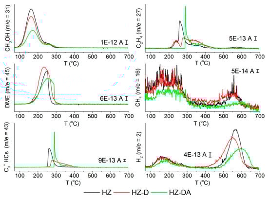 Figure 7 shows the TPD of methanol profiles. The desorption of hydrogen, methane, ethylene, methanol, C3+ hydrocarbons, and DME were monitored by m/e = 2, 16, 27, 31, 43, and 45, respectively. Desorbed methanol was detected mostly below 200 °C, indicating an operating condition in which methanol conversion had not completed and side reaction should be suppressed [32]. DME was observed in the range from 150 °C to 300 °C, a so-called pre-inition phase of methanol conversion [33], which can be used to interpret the bonding strength of the Brønsted acid [32]. The desorption peak of DME increased with the following trend: HZ-D (230 °C) < HZ (249 °C) < HZ-DA (256 °C), in line with the Brønsted acidity observed from NH3-TPD. C3+ hydrocarbons and ethylene profiles were quite similar; their desorption temperatures were quite close to each other in the temperature range (250–400 °C) of an autocatalysis system [34,35,36]. Ethylene is a tracer of the arene cycle, while C3+ hydrocarbons are produced through the alkene cycle [36,37,38]. The closely-neighboring desorption temperatures of C3+ hydrocarbons and ethylene emphasize that arene and alkene cycled proceed concurrently and are highly interwined [39]. The desorbed CH4 and H2 profiles seemed to be coherent, showing two responses in 100–300 °C and 400–700 °C ranges. The low-temperature responses should be related to the contributions of ionized fragments (m/e = 16 and 2) of methanol [40] because the formation of methane and the desorption of dihydrogen are thermodynamically unfavorable below 300 °C [41,42]. Methane originates from the reduction of chemisorbed methoxy species through the hydride transfer [36,42], while dihydrogen should be produced from the combination of two chemisorbed hydrides [41]. Accordingly, the desorption behavior of methane and dihydrogen is associated with hydride mobility. The onset and the peak position of desorbed methane increased in the following order: HZ-D (450 and 545 °C) < HZ (487 and 550 °C) < HZ-DA (510 and 603 °C), which was in line with the trend of desorbed dihydrogen as follows: HZ-D (392 and 545 °C) < HZ (463 and 567 °C) < HZ-DA (481 and 600 °C). This trend underlines that chemisorbed hydride in HZ-D had the highest mobility, while HZ-DA had the lowest one. Since dihydrogen has negligible transfer limitation in micropore channels, and dehydroxylation of the Brønsted acid via the pathway of dehydrogenation is negligible when the temperature is below 600 °C [43], it is rational to hypothesize that there is a correlation between hydride mobility and Lewis acid concentration in the catalyst. That is, the higher the Lewis acid concentration, the more mobile hydride can exist. Thus, aromatic molecules are subsequently formed via the hydride transfer of olefin precursors [36]; therefore, the trend of hydride mobility may be considered as the indication of the aromatization activity of MTA catalysis on the premise that the space confinement for the cracking of aromatics can be ignored.