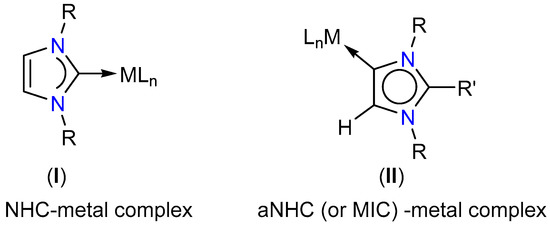 NHC- (I) and aNHC- (or MIC) (II) complexes.