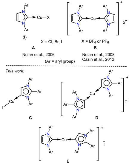 - Santoro, O.; Lazreg, F.; Cordes, D.B.; Slawin, A.M.Z.; Cazin, C.S.J. Homoleptic and heteroleptic bis-NHC Cu(I) complexes as carbene transfer reagents. Dalton Trans. 2016, 45, 4970–4973. [Google Scholar] [CrossRef] [PubMed]