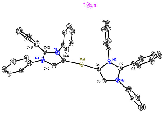 Molecular structure of [Cu(aIPrPh)2]I (4). Anisotropic displacement parameters are depicted at the 50% probability level. Hydrogen atoms and isopropyl groups are omitted for clarity. Selected bond lengths (Å) and bond angles (°): C44–Cu1, 1.914(3); C4–Cu1, 1.914(3); C4–C5, 1.356(4); C44–C45, 1.363(4); C44–Cu1–C4, 172.66(12); N1–C42–N4, 106.3(2); N2–C4–C5, 102.7(2); N3–C2–N2, 107.4(3).