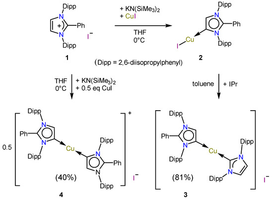 Treatment of a THF suspension of (IPrPh)I (1) and CuI with one eq of potassium hexamehtyldisilazide (KHMDS) (Scheme 1) leads to the formation of complex Cu(aIPrPh)I (2) (91%) [45]. Reaction of compound 2 with one equivalent of free IPr cleanly affords the heteroleptic copper complex [Cu(aIPrPh)(IPr)]I (3) (81%), containing both aNHC and NHC ligands. Similarly, treatment of a mixture of 1 and CuI in a 2:1 molar ration with two equivalents of KHMDS gives the complex [(aIPrPh)2Cu]I (4) (40%). Compounds 2, 3, and 4 are colorless crystalline solids that are stable under an inert gas atmosphere.