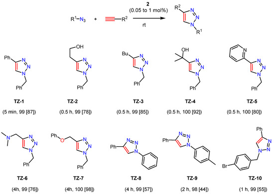 Scope of the [3+2] cycloaddition of azides and alkynes with compound 2. Reaction conditions: azide (1 mmol), alkyne (1.1 mmol), 2 (1, 0.5, or 0.05 mol %), rt (25 °C), solvent-free. Reaction time, NMR yield [Isolated yield] for triazoles TZ-1 to TZ-10.
