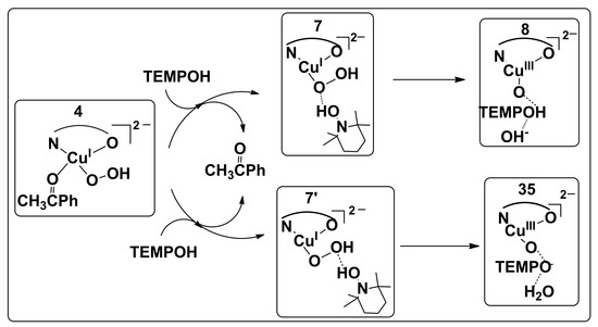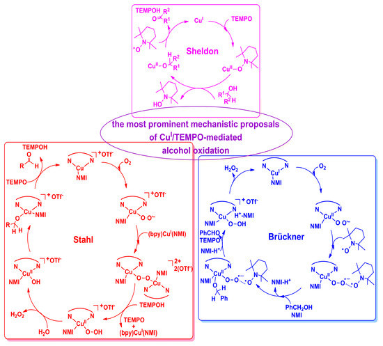 - Hoover, J.M.; Ryland, B.L.; Stahl, S.S. Mechanism of copper(I)/TEMPO-catalyzed aerobic alcohol oxidation. J. Am. Chem. Soc. 2013, 135, 2357–2367. [Google Scholar] [CrossRef] [PubMed]
