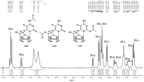 1H-NMR spectrum of the crude product obtained from cytidine acetylation.