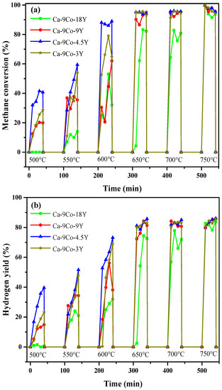 To study the effect of yttrium promoter on the structural properties and activity of Ca-Co bifunctional catalyst/sorbent, Ca-9Co-nY samples with different calcium to yttrium mass ratios (n = 3.0, 4.5, 9.0, 18.0) were synthesized and examined in CLSMR process at different reduction temperatures (Figure 7). It shows that raising the reduction temperature increases methane conversion and hydrogen yield for all samples. For instance, methane conversion and hydrogen yield are about 20.9% and 15.0% at 500 °C and reach to about 96.9% and 83.4% at 750 °C for Ca-9Co-3Y, respectively. As indicated in Figure 7c, by decreasing the calcium to yttrium mass ratio from 18 to 4.5, the average H2/CO molar ratio is increased from about 4.5 to 5.3 at 700 °C. The average H2/CO molar ratio was decreased slightly by further increment of yttrium content. It shows that the addition of yttrium content increases the porosity of catalyst/sorbent and improves the dispersion of cobalt and availability of calcium oxide in the catalyst structure. Therefore, the amount of produced hydrogen is increased and subsequently hydrogen to carbon monoxide molar ratio is enhanced. In addition, the higher surface area of promoted sample (indicated in Table 1) shows the better tendency of catalyst/sorbent on both activity and selectivity of produced components. The activity of catalysts were in the order of Ca-9Co-4.5Y Ca-9Co-9Y Ca-9Co-18Y. The higher amount of yttrium improved the performance of catalyst because increasing the porosity and specific surface area of catalyst could significantly enhance the oxygen carrier capability to transition of lattice oxygen [46,47]. Moreover, increasing the surface area could increase the availability of bifunctional catalyst/sorbent active sites for reaction with methane (Equation (7)). According to this figure, further increase in yttrium content of catalyst/sorbent reveals negative effect on methane conversion, hydrogen yield and average H2/CO molar ratio for most temperatures. It could be due to the reduction in the amounts of calcium and cobalt oxides in the structure of catalyst/sorbents and covering the active cites with excessive yttrium oxide [43,48]. The comparison of Figure 6 and Figure 7 evidences that yttrium could modify the catalyst performance and increases the methane conversion and hydrogen yield mainly at lower temperatures. For example, methane conversion is increased from about zero at 500 °C and 95.9% at 750 °C for Ca-9Co catalyst/sorbent to about 37.2% at 500 °C and 97.8% at 750 °C for Ca-9Co-4.5Y. When temperature is increased from 500 to 750 °C the hydrogen yield is changed from about 29.9% to 83.8% for Ca-9Co-4.5Y, while it is 0.0% and 82.2% for Ca-9Co, respectively. Consequently, Ca-9Co-4.5Y is selected as an excellent bifunctional catalyst/sorbent with highest activity in CLSMR process.