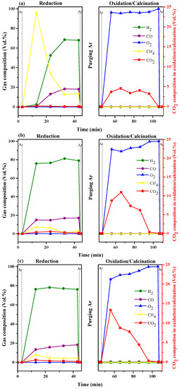 In this reaction, calcium oxide is transformed to calcium carbonate and thus a calcination step is required for returning to its initial state. The calcination of calcium carbonate is performed at high temperature in the second reactor owing to the endothermic nature of the regeneration reaction (Equation (7)). The third reactor is applied in order to reoxidize the reduced oxygen carrier [27,35].