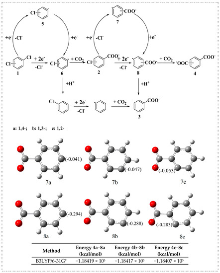 As shown in Figure 2, two successive irreversible cathodic peaks corresponding to the two-electron transfer reaction of the C–Cl bond were detected for all the three dichlorobenzenes on the Ag electrode. The cathodic peak potentials of the three dichlorobenzenes were very close. Electrolysis of 1b and 1c was conducted under the optimized conditions. As shown in Table 2, halogenated monocarboxylation product 2 was obtained for all the three dichlorobenzenes, and the yield of 2 decreased from 43.7% to 38.4% in the following order: 2c > 2b > 2a. The yield correlated with the first peak current of 1 (Figure 2): 1c (0.103 mA) > 1b (0.097 mA) > 1a (0.079 mA). High yields were obtained when the first peak current of 1 was large. In addition, dehalogenated monocarboxylation product 3 was detected for all the three dichlorobenzenes. Surprisingly, dicarboxylation products 4b and 4c were not detected. To understand this phenomenon, the proposed pathways for the electrocarboxylation of dichlorobenzene were studied, and energy calculations were performed using the Gaussian09W program (Revision A.1, Gaussian, Inc., Wallingford, CT, USA, 2009).