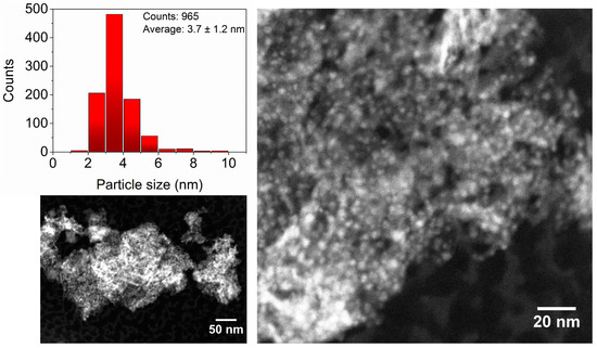 As shown in Figure 1, electron microscopy revealed a homogeneous dispersion of the particles on the support resulting in small Ni particles with a diameter of 3.7 ± 1.2 nm, a narrow size distribution and a Ni dispersion of 21%. These values are comparable with those reported in the literature for supported Ni catalysts that were prepared using the same preparation technique [37,38].