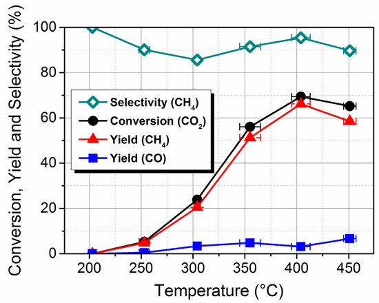 Conversion of CO2 (black), yield of CH4 (red) and yield of CO (blue), as well as selectivity of CH4 (green) for the 10 wt % Ni/Al2O3 catalyst; conditions: stainless steel tubular fixed-bed reactor, 150 mg catalyst, H2/CO2 = 4, 75% N2, p = 1 atm, T = 200–450 °C, gas hourly space velocity (GHSV) of 26,700 h−1 and weight hourly space velocity (WHSV) of 12,000 mLCO2/(gcat·h).