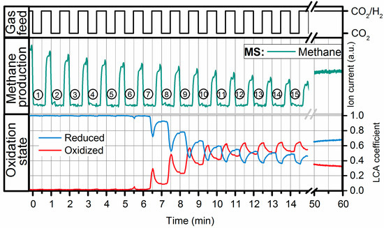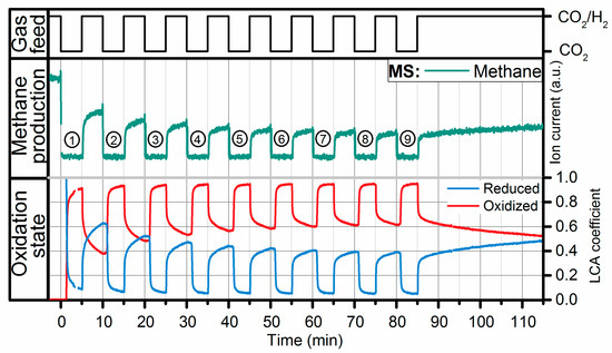 Methanation of CO2 during dynamic operation switching every 300 s between methanation conditions (H2/CO2 = 4) and CO2 at constant WHSV of 12,000 mL CO2/(gcat·h) and GHSV of 71,700 h−1. The figure shows the valve signal in the upper part (black), the CH4 signal of the MS (m/z 15) in the middle part (green) and the fraction of reduced (blue) and oxidized (red) Ni from LCA of the XANES spectra. The numbers in cycles count the H2 dropouts.