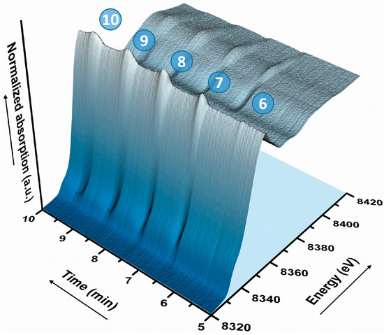 Section of the X-ray absorption near edge structure (XANES) spectra during the 30-s H2 dropout modulation (dropout Nos. 6–10 according to Figure 3).