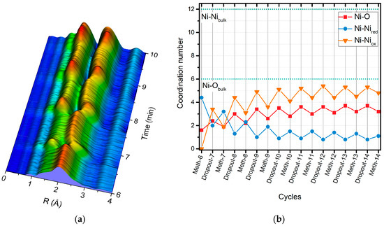 (a) Fourier-transformed extended X-ray absorption fine structure (FT EXAFS) data (k: 3–11 Å−1; k2-weighted, not phase corrected) during 30-s H2 dropouts (starting at the methanation sequence before the seventh H2 dropout (Meth-6)); (b) Results of the EXAFS fitting analysis during the 30-s modulation. The final spectra of each sequence (methanation sequences labeled as “Meth”) were analyzed (details, cf. the Supplementary Materials). The coordination numbers (N) of neighboring atoms are presented: Ni-O and Ni-Niox correspond to O and Ni coordination numbers, respectively, in oxidized nickel and Ni-Nired to the coordination number of the first nickel shell in reduced nickel.