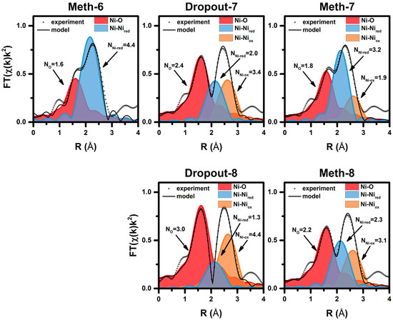 Experimental and simulated FT EXAFS data (magnitude, not phase shift corrected) of the Ni catalyst during 30-s modulation, in addition, the estimated Ni coordination numbers (Cycles 6–8), k-range 3–9 Å−1, k-weight = 2 (for details, see the Supplementary Materials).