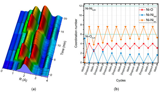 (a) FT EXAFS data (k: 3–11 Å−1; k2-weighted) during repeated 300-s H2 dropouts; (b) Results of the EXAFS fitting analysis during the 300-s modulation. The final spectra of each sequence were analyzed. The coordination numbers of neighboring atoms are presented: Ni-O and Ni-O-Ni correspond to O and Ni coordination numbers, respectively, in oxidized nickel and Ni-Ni to the coordination number of the first nickel shell in reduced nickel.