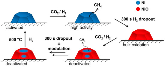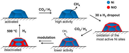 Figure 9 and Figure 10 show schemes of the Ni particles during the dynamic methanation of CO2. Short-term H2 dropout (Figure 9) first led to an oxidation of the most reactive sites such as low coordinated Ni atoms located at step sites, defect sites or at the interface to the support material [48,49,50,51,52]. Particularly, the interface sites appear important for the methanation of CO2, since the key steps of the hydrogenation are speculated to take place at the interface of the metal particle and support [53,54]. Furthermore, step sites are more reactive in CO dissociation compared to plane facets [51,55]. NiO islands may form and grow to NiO structures of several layers [56,57]. Diffusion of oxygen into the bulk did not occur due to the short period of less reducing atmosphere. Full oxidation of the Ni particles was interrupted, and NiO planes were reduced partly in the methanation atmosphere.