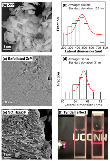 The procedures for the preparation of SO3H@ZrP are illustrated in Figure 1. The pristine ZrP (Figure 2a) was exhibited as hexagonal crystal discs with an average lateral dimension of ca. 450 nm, and Figure 2b shows the size distribution of the discs. The micro-crystals were exfoliated by TBA to form individual single-layer nanosheets (Figure 2c) [29,32]. Because of the ultrasonication treatment, the single-layer nanosheets were broken down into smaller pieces, with an average lateral dimension of ca. 66 nm (Figure 2d). After grafting γ-propyl mercaptotrimethoxysilane onto the nanosheet surface and the subsequent oxidation to form SO3H@ZrP, the ZrP host maintained a sheet structure (Figure 2e). The –SO3H groups could interact with water molecules to form hydrogen bonds, which facilitated the re-stacking of SO3H@ZrP nanosheets during drying (Figure 2e). Note that the morphology shown in Figure 2e only represents the state of SO3H@ZrP nanosheets in the solid phase. When SO3H@ZrP nanosheets are dispersed in the liquid reaction system (a mixture of oleic acid and methanol), one can clearly observe the Tyndall effect (Figure 2f), suggesting that SO3H@ZrP nanosheets could be uniformly dispersed to form a homogeneous dispersion. Meanwhile, SO3H@ZrP nanosheets can be easily separated from the dispersion via centrifugation, exhibiting advantages of both homogeneous and heterogeneous catalysts.
