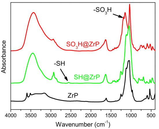 FTIR spectra of the pristine ZrP, SH@ZrP, and SO3H@ZrP.