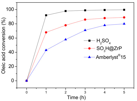 The esterification reaction results of oleic acid with methanol catalyzed by SO3H@ZrP, H2SO4, and Amberlyst® 15 are shown in Figure 4. The conversion increased steadily, and gradually slowed down and plateaued for each catalyzed reaction. Liquid H2SO4 exhibited the highest catalytic activity of virtually 100% oleic conversion. The catalytic activity of SO3H@ZrP solid acid is slightly lower, which resulted in a ca. 89% conversion rate after 5 h of reaction. The slightly lower catalytic activity of SO3H@ZrP in comparison to liquid H2SO4 is expected, as liquid H2SO4 exhibits the highest possible miscibility and accessibility, as well as a much higher mole amount of functional –SO3H per unit mass, while in SO3H@ZrP, the –SO3H groups are supported on ZrP nanosheets. However, SO3H@ZrP exhibited higher catalytic activity than the commercial Amberlyst® 15 catalyst, one of the most popular commercial solid acid catalysts. This can be ascribed to the high density of the sulfonic acid groups on the surface of ZrP nanosheets, and their high dispersion and thus high accessibility in the reaction system.