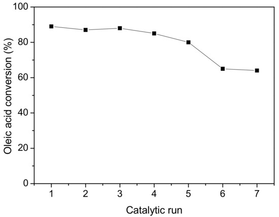 The recyclability of SO3H@ZrP solid acid in the esterification of oleic acid with methanol is shown in Figure 5. There is a loss of ca. 9% in the conversion rate after five cycles of reaction, and a loss of ca. 25% in the conversion rate after seven cycles. During catalyst recovery using centrifuge, a trace amount of catalyst was attached to the centrifuge tube, which did not participate in the next catalytic run. So the loss of catalytic activity is believed to be due to the leaching of catalyst during separation at a lab scale, which can be minimized on a large industry scale, rather than from the deactivation of the functional groups. Note that after each cycle of reaction, the SO3H@ZrP solid acid catalyst was simply washed with CH2Cl2 to prepare for the next cycle, but no attempt to regenerate the catalyst was made.
