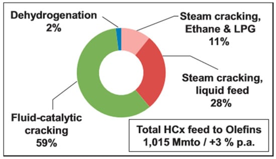 The importance of C2–C4 olefins (i.e., C2H4, C3H6, butenes, and C4H6) has been highlighted because of their numerous applications as key building blocks in the chemical industry, linked with the increasing needs of the expanding global population [1]. These lower olefins are the most prevalent organic compounds, with the highest production volumes, worldwide, highly dependent on crude oil and natural gas products [2]. It is estimated that 400 million tons of olefins are annually produced, using one billion tons as hydrocarbon feedstock, via processes such as fluid-catalytic cracking, steam cracking, and dehydrogenation [3]. Almost 60% of the global feedstocks are used in FCC units, and approximately 40% in steam cracking processes. (Figure 1) Produced olefins can be used in a wide spectrum of high-end applications such as packaging, construction, solvents, coatings, and synthetic fibers [4].