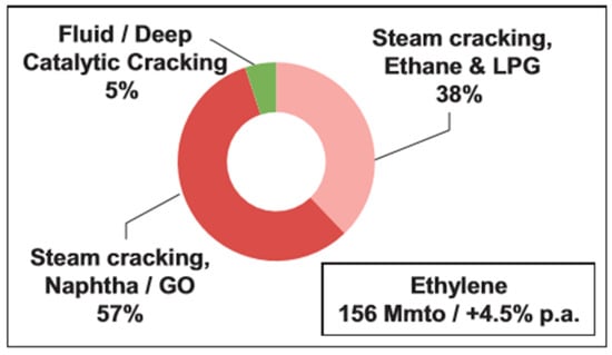 C2H4 constitutes the most predominant olefin in the global market and is primarily produced via naphtha steam cracking, among various hydrocarbon feedstocks, as well as through ethane thermal cracking. Globally, 57% (Figure 2) of the C2H4 volume is produced via naphtha and gas oil steam cracking and 38% through ethane and LPG (Liquefied Petroleum Gas) steam cracking. Naphtha is a liquid fraction obtained from petroleum refining processes, such as catalytic cracking and hydrocracking. Depending on its origin, it contains variable amounts of paraffins, aromatic, and olefinic compounds. The ratio of these components can indicate the process that the specific fraction can be used for the optimum results. At high temperatures (i.e., 650–750 °C), naphtha and gas oil can yield 30 and 25 wt. % of C2H4, respectively. In the case of ethane, added along with naphtha in the feed stream, yields of C2H4 can reach 80 wt. % [5]. Its eminent industrial uses cause the world demand for C2H4 to incessantly increase, as it can be used for significant applications, such as the production of intermediate chemicals, mainly in the industry of plastics. i.e., polymers (e.g., poly-ethylene), propionaldehyde—via hydroformylation, vinyl chloride—via halogenation and de-hydrohalogenation, alpha-olefins—via oligomerization, and C2H4 oxide and acetaldehyde—via oxidation [4,6,7]. In recent years, bio-ethanol has been extensively studied as an alternate feedstock for C2H4 production [8]. Other bio-derived compounds such as methanol and dimethyl-ether, can also be used as a feedstock for C2H4, via Methanol to Olefins (MTO) and Dimethyl-ether to Olefins (DMTO) processes [9,10]. Bio-ethylene can also be produced via bio-synthesis from various enzymes or microorganisms [11].