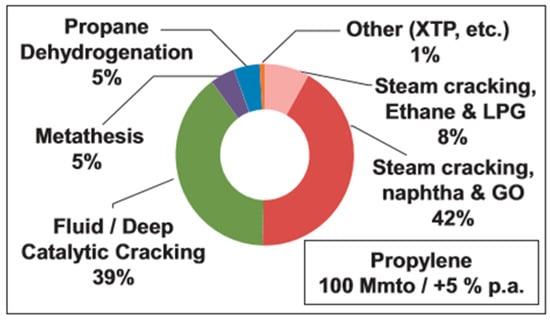 - Eisele, P.; Killpack, R. Propene. In Ullmann’s Encyclopedia of Industrial Chemistry; Wiley-VCH Verlag GmbH & Co. KGaA: Weinheim, Germany, 2011; ISBN 9783527306732. [Google Scholar]