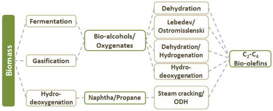 Following the incessantly increasing demand worldwide, technological advances have enabled the production of light olefins from various biomass-derived feedstocks, obtaining mainly mixtures of C2–C4 olefins. Specific processes can be selective to the production of a certain product, as will be discussed in this chapter. Overall, olefins from biomass are predominantly produced from biomass intermediates, and more specifically, from alcohols, diols, and other oxygenates. These intermediates are, in most cases, formed via fermentation, hydro-deoxygenation, or gasification processes (Figure 5).