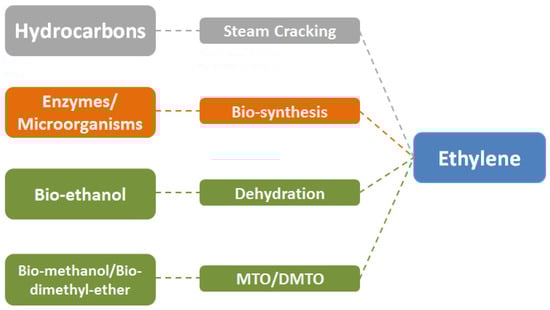 As mentioned above, steam cracking (mainly using naphtha as a feedstock) is the most extensively used process for C2H4 production from hydrocarbons. Steam cracking operating conditions require vast amounts of energy, thus increasing the production cost, and heavily contributing to environmental issues. Even though the installed technology for these processes has already been modified for increased efficiency, novel production methods have been explored in order to reduce production cost and to substitute the finite fossil resources. Apart from C2H4 conventional production from petrochemicals, C2H4 can be effectively produced from renewable feedstocks, such as plants, microorganisms, and bio-alcohols (Figure 6).