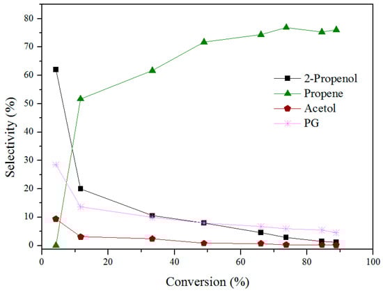Yu et al used Ir/ZrO2 and H-ZSM5 catalysts, in two steps, in order to selectively produce C3H6 via hydro-deoxygenation in a fixed-dual-bed reactor. Over the optimized reaction conditions (i.e., 250 °C and 1 bar hydrogen pressure), selectivity to C3H6 reached 85.0%, for complete glycerol conversion [89]. (Table 3) Sun et al. used WO3-Cu/Al2O3 catalysts, at 250 °C under hydrogen flow (atmospheric pressure) to obtain 47.4% selectivity to C3H6 for 100% glycerol conversion [91]. Combining WO3-Cu/Al2O3 and SiO2-Al2O3 in a dual-bed reactor, selectivity to C3H6 reached 84.8%. Mota et al, used Fe/Mo catalysts supported on activated carbon to obtain 100 glycerol conversion and 90.0% selectivity to C3H6 at 300 °C [92]. In all the above studies, a number of by-products has been detected in the gas phase (e.g., carbon dioxide, propane, and ethylene). Further studies by our group, in a batch reactor, over molybdena-based catalysts supported on carbon, report glycerol production into C3H6 with 100% selectivity in the gas phase (88.0% glycerol conversion and 76.0% selectivity to C3H6) at 300 °C and under hydrogen atmosphere (80 bar) (Figure 8) [90]. Our group has also proven that reducible molybdenum oxides selectively drive this reaction into C3H6, most probably via a reverse Mars—van Krevelen mechanism; formation of Mo4+ and Mo5+ species most likely drives the reaction to the formation of the desired product. C3H6 is most probably formed via two consecutive cycles, in a one-step reaction: (a) due to the presence of oxygen vacancies, the adsorption of glycerol proceeds with the two adjacent hydroxyls forming an unstable cyclic intermediate which in turn is released as 2-propenol and (b) the latter after re-adsorption with the remaining hydroxyl is further deoxygenated to C3H6 [93]. Dow Global Technologies have patented a GTO process in a batch reactor, reaching 96% selectivity to C3H6 for 24% glycerol conversion. Hydroiodic acid acts as a catalyst in subsequent reduction-oxidation cycles, over reductive atmosphere [92].