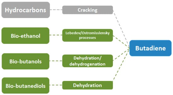 Alternative feedstocks have been proposed in order to effectively produce bio-butadiene from renewable resources, thus substituting the energy consuming processes of naphtha cracking. In Figure 9, the various production processes for C4H6 are summarized.