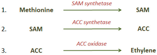 - Yang, S.F.; Hoffman, N.E. Ethylene Biosynthesis and its Regulation in Higher Plants. Annu. Rev. Plant Physiol. 1984, 35, 155–189. [Google Scholar] [CrossRef]